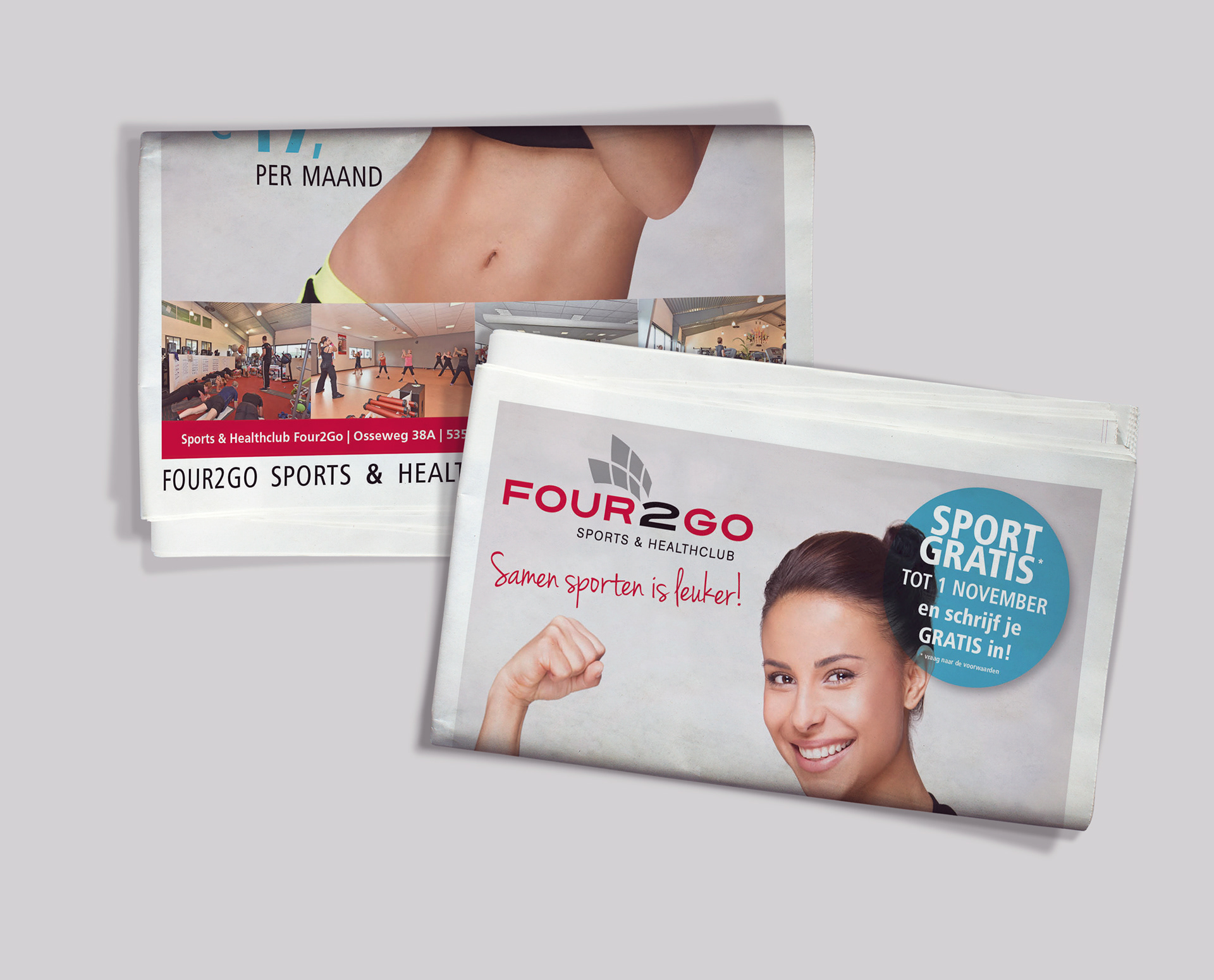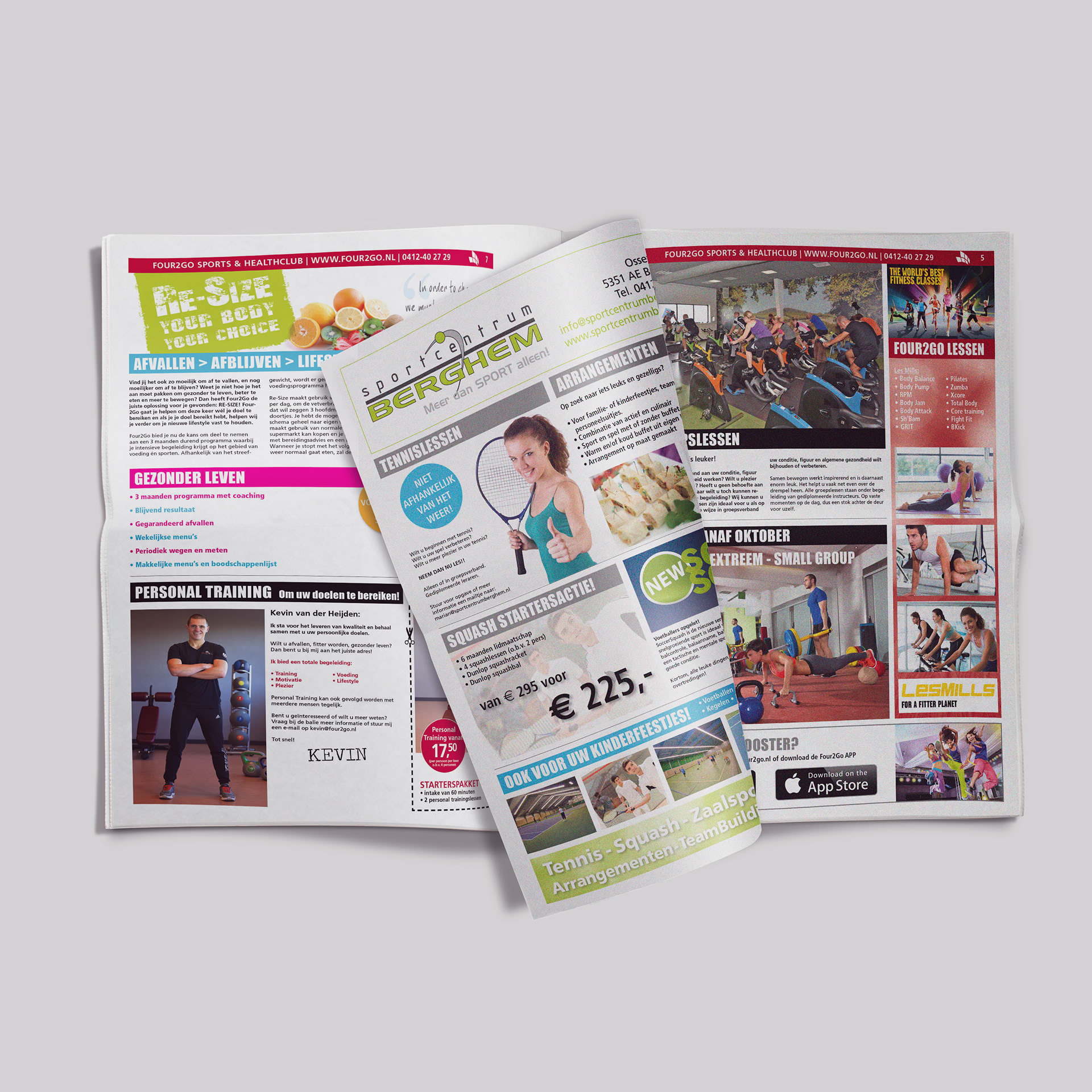 Voor Sports & Healthclub Four2Go heb ik een 8 pagina krant opgemaakt met zowel artikelen en advertenties. In opdracht van FitnessMedia.